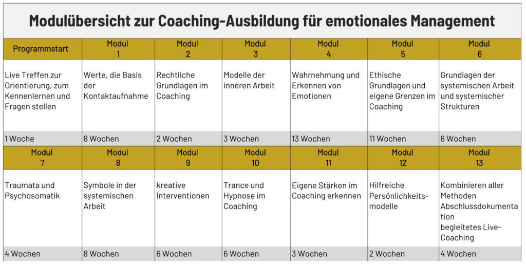Die Module sind unterschiedlich lang, je nach Themengebiet. Du beschäftigst dich mit systemischen Aufstellungen und Familienaufstellungen genauso wie mit Fragetechniken, Stressbewältigung, Reframing, nonverbaler Kommunikation, Körpersprache, Hypnose, Krisen-Coaching, Konflikten, Mentalcoaching, und vielem mehr. Hier hast du eine Übersicht: